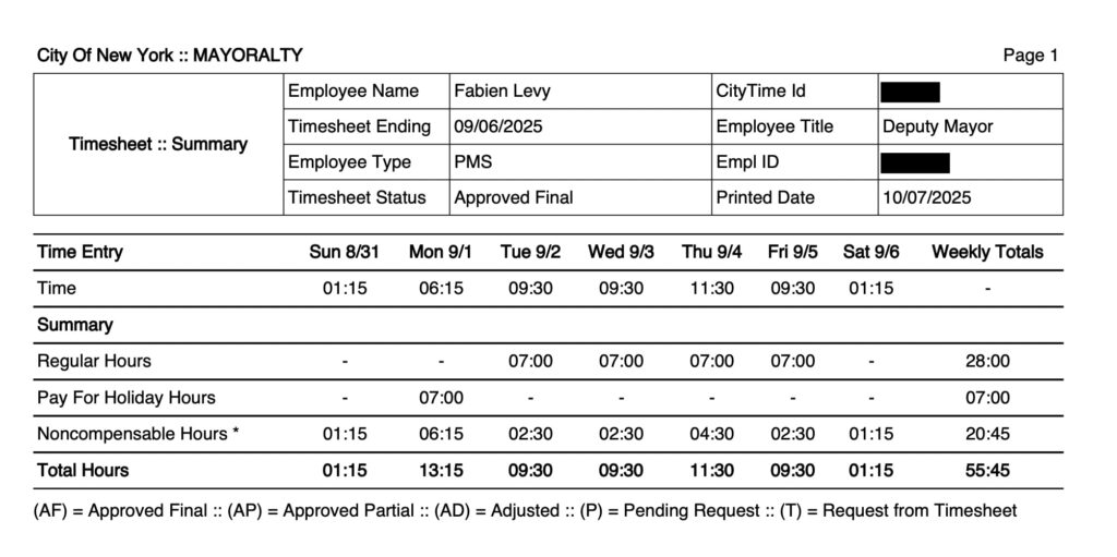 “I wasn’t very involved on the campaign, so it was only a handful of hours, but every time I volunteered in any way for the campaign or attended an event (for example his kickoff) on a weekday, I marked the time on my calendar as being off,” Levy told Hell Gate when reached for comment. “I then made sure those hours did not count towards my daily total number of hours worked on my timesheet.”