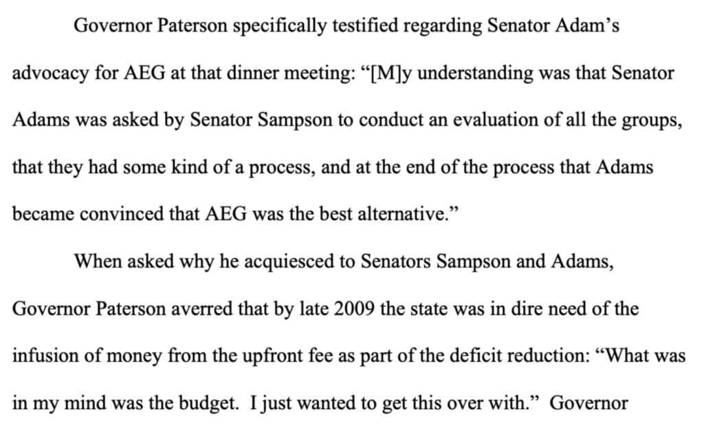 Of that dinner, Paterson told investigators that “my understanding was that Senator Adams was asked by Senator Sampson to conduct an evaluation of all the groups, that they had some kind of a process, and at the end of the process that Adams became convinced that AEG was the best alternative.” Why did he agree with Adams and Sampson? “What was in my mind was the budget. I just wanted to get this over with,” he said.